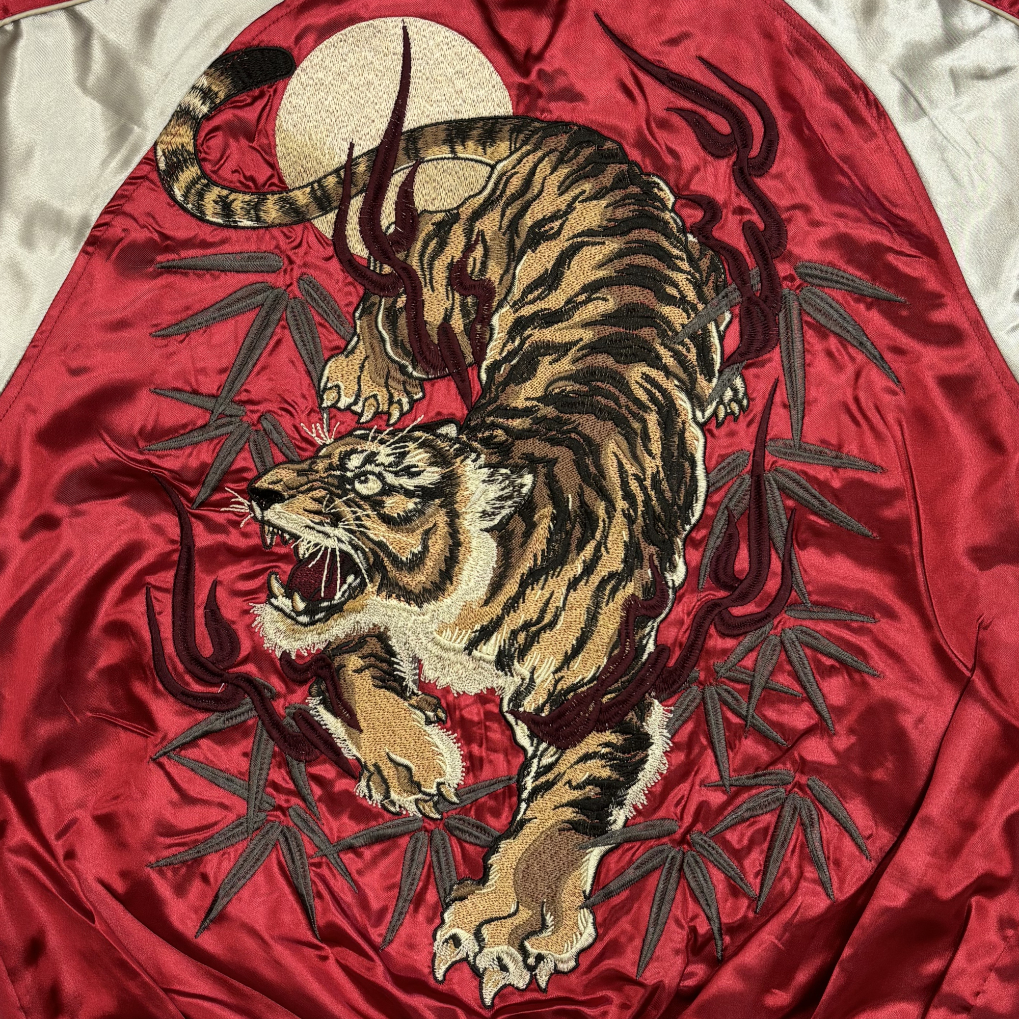 満月と笹の葉をバックに炎をまとって咆哮する虎を全体にフューチャーした迫力あるスカジャン!可能な限り大きな絵柄を入れられるようデザインされた構図が印象的、繊細な仕上げで紡ぎ出された刺繍は見事の一言です。フロント左右にも満月&虎を施した豪華な仕上がり、合わせやすい定番カラーリング3色をご用意いたしました。数量限定モデル。【中綿抜きモデル】
