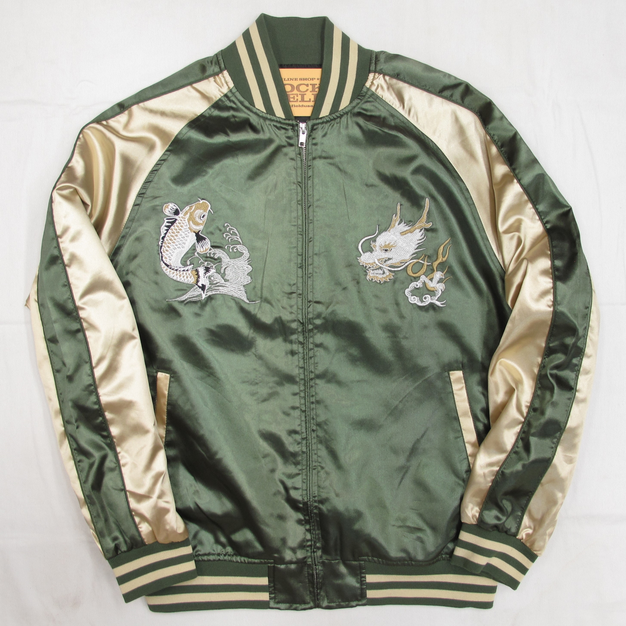BRSL-003 サテン 龍鯉波 スカジャン(中綿あり)《ダークグリーン×ベージュ》