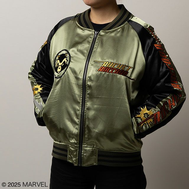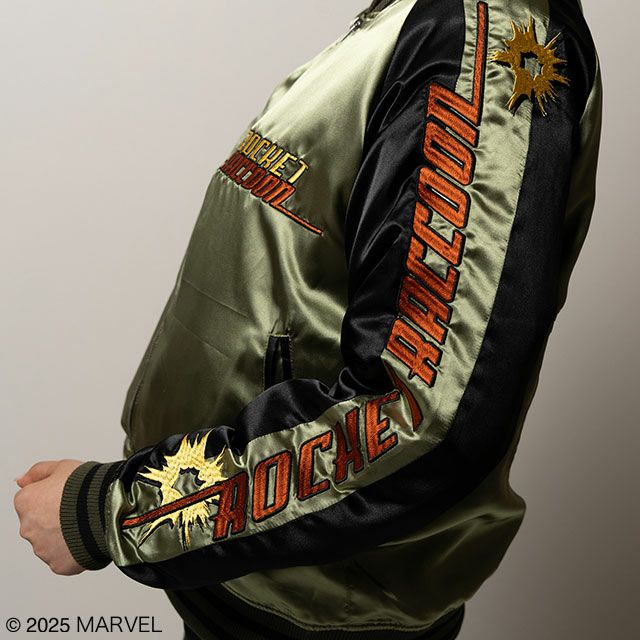 世界中で大人気のコミック「MARVEL」のスカジャンが登場♪オリーブ×ブラックのカラーリングがキャッチーなファン必見のアイテム。フロントにはロケット・ラクーンマーク、腕部にもロケットの名前が施され、バックにはメンバーのロケットが豪華な刺繍で大胆に描かれています。高品質な素材を使用し、快適な着心地を実現。日常のカジュアルな装いに特別なアクセントを加えるアイテム。【中綿抜きモデル】