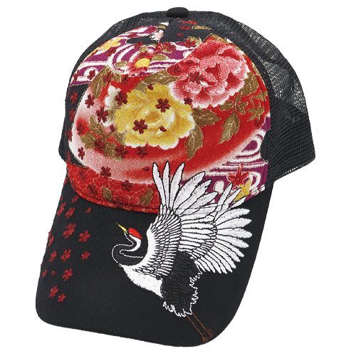 舞い散る桜とともに天に羽ばたく鶴を総天然色で優雅に描き出した和柄刺繍キャップ。背面アジャスターで調整可能な男女兼用フリーサイズ。
