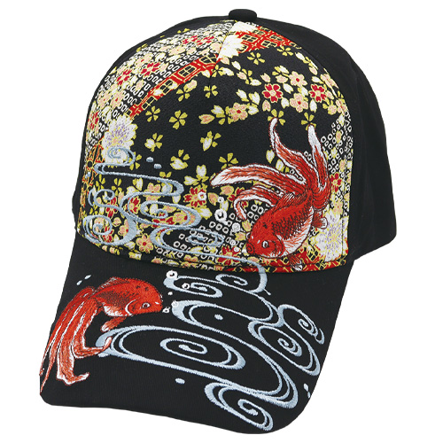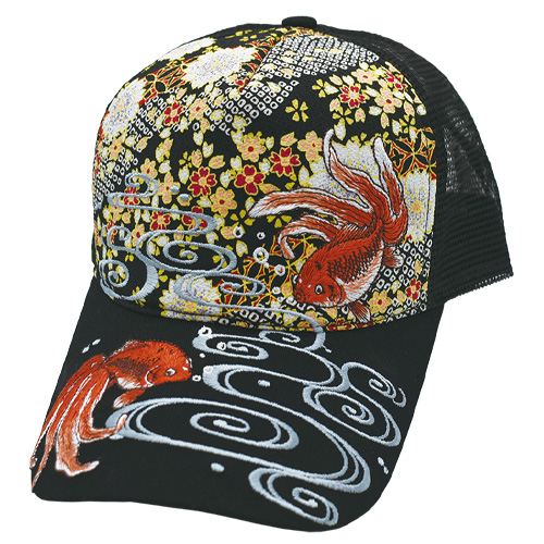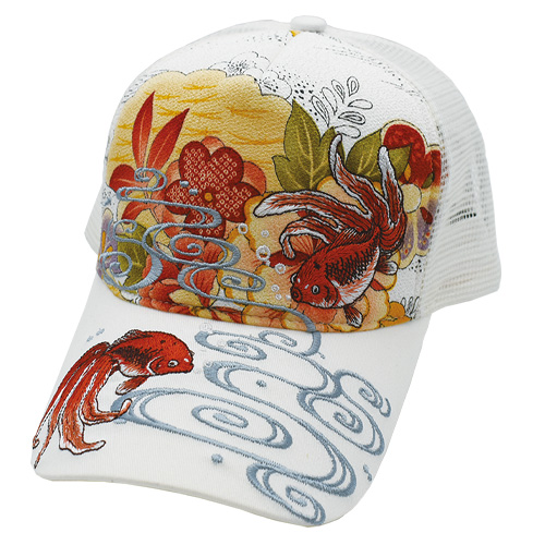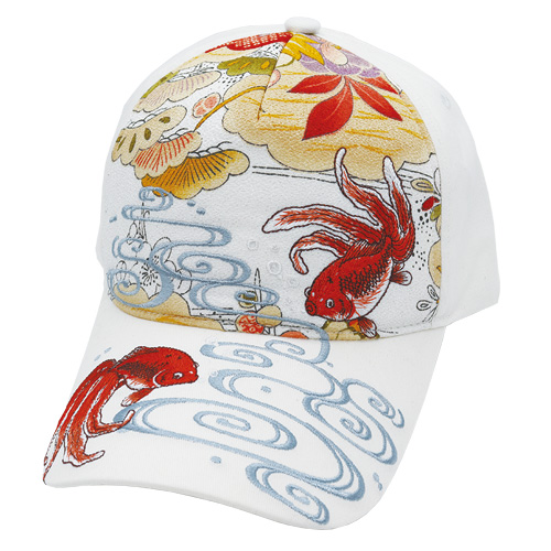 和柄生地をバックに流水を泳ぐ金魚を総天然色で優雅に描き出した和柄刺繍キャップ。背面アジャスターで調整可能な男女兼用フリーサイズ。