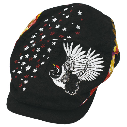 舞い散る桜とともに天に羽ばたく鶴を総天然色で優雅に描き出した和柄ハンチング。サイドアシャスターで調整可能な男女兼用フリーサイズ。
