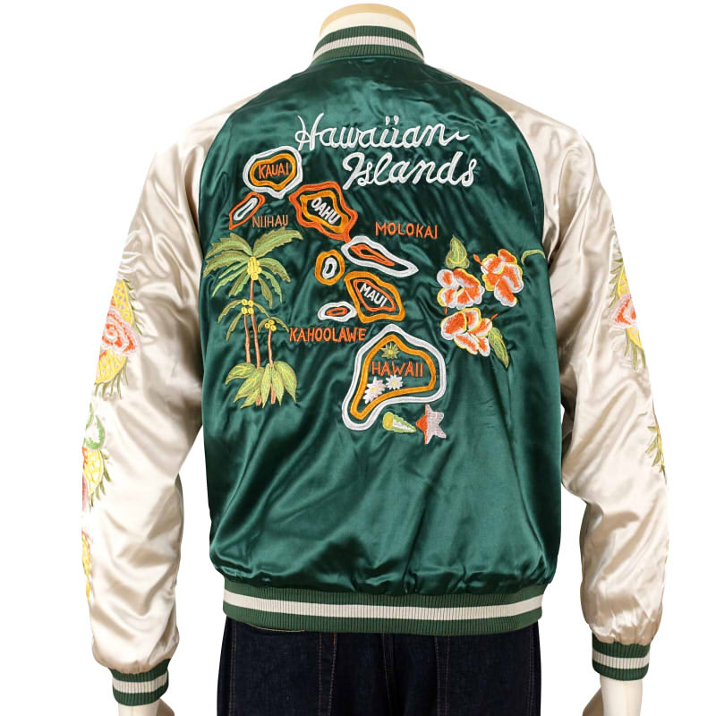HGSK-041 ハワイ地図と白虎 刺繍 リバーシブル スカジャン《グリーン×ベージュ》《ホワイトシルバー×ホワイトシルバー》