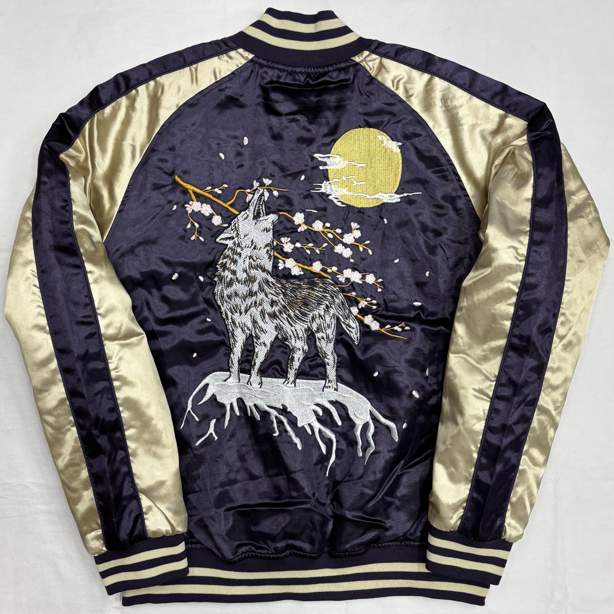 非常に珍しい狼スカジャン!舞い散る桜の中、満月を背に遠吠えする狼の全身を描いたゴージャスな仕上がりで、可能な限り大きな絵柄を入れられるよう計算された構図も印象的。数量限定モデル。