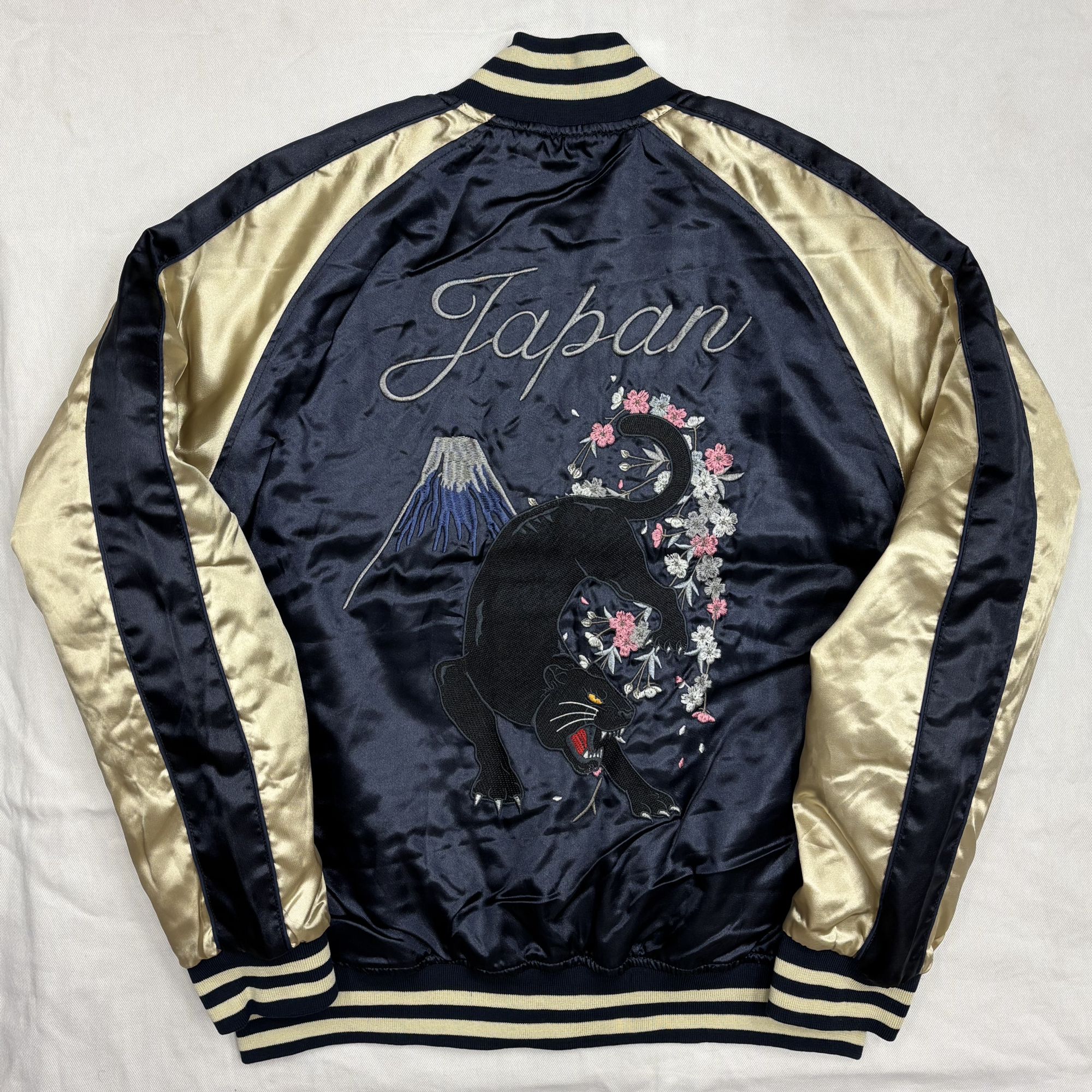 BRSL-010 サテン 黒豹 スカジャン(中綿あり)《ネイビー×ベージュ》