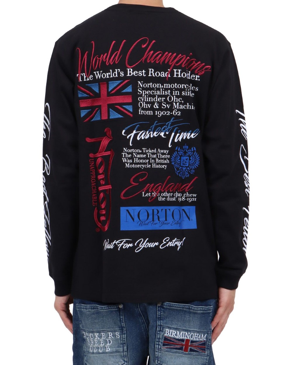 刺繍とプリントを駆使した存在感を放つロンTEE。バックにはユニオンジャック・ノートンロゴ・エンブレム・メッセージロゴを大胆にあしらい、Nortonらしい世界観を凝縮した1枚に仕上げました。