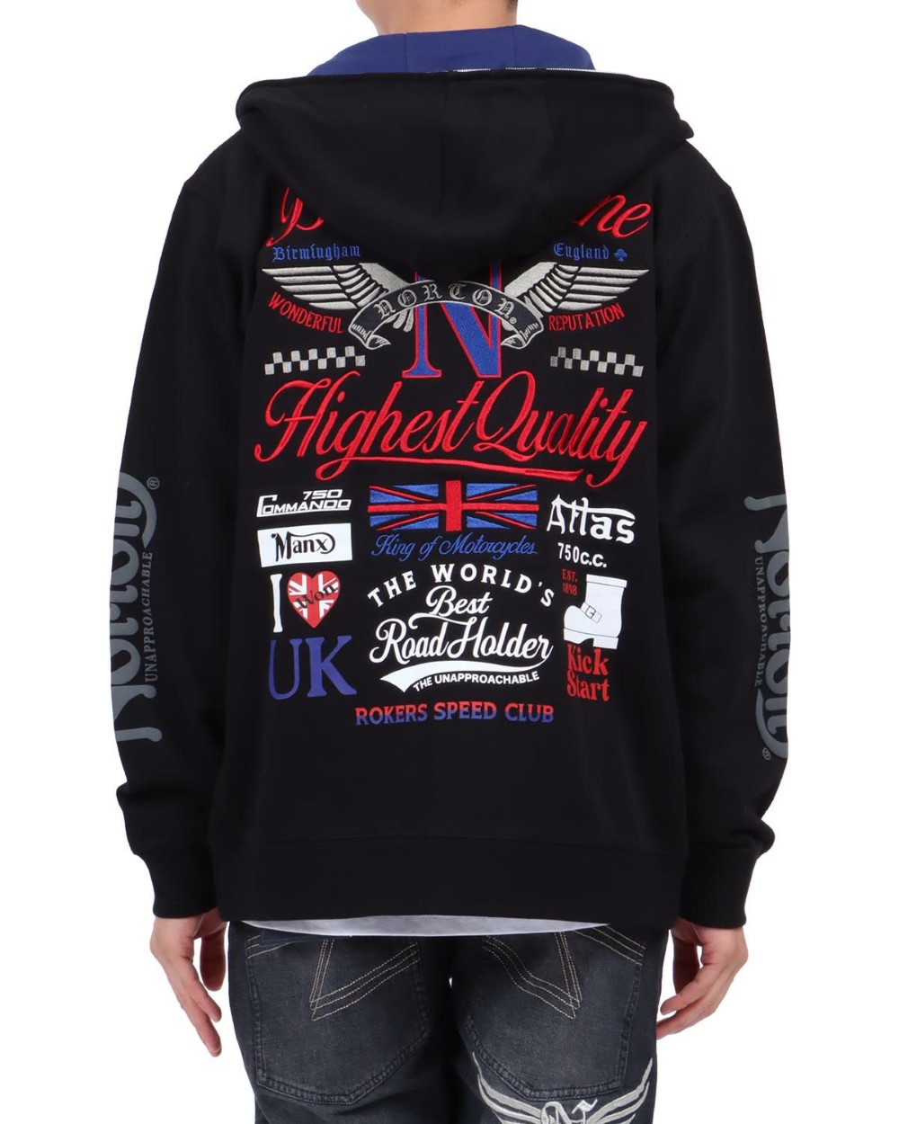 胸にファスナーポケットを付け、ライダースジャケット要素をプラスしたジップパーカー。ラメ刺繍・サガラワッペン・フェルトワッペンなどNortonならではの様々な豪華加工を施しました。