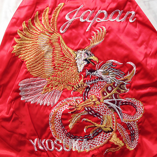 数あるスカジャンの中で最もポピュラーな図柄『鷹龍』。飽きのこないデザインで人気のある定番中の定番商品!ゴールド×シルバー刺繍で、派手でありつつも落ち着いた大人のスカジャンです。スタンダードな『JAPAN』『YOKOSUKA』入り!