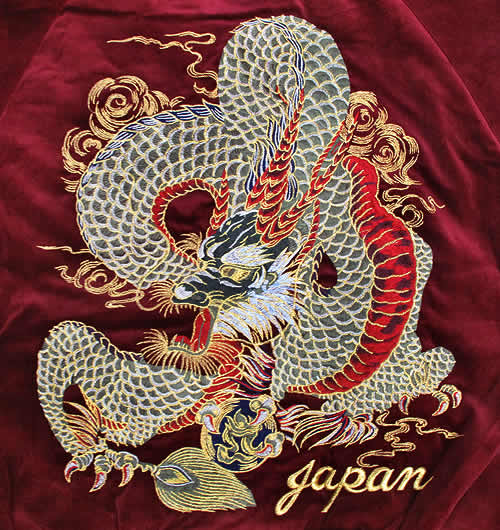 フロント・バックだけでなく腕部にも刺繍の入ったゴージャスなタイプ。大胆かつ繊細な仕上がりで、もっとも針数を使った多色の龍は迫力はバツグン!絵柄の美しさと躍動感が他とは大きく違う自信のモデルです。『JAPAN』入り。