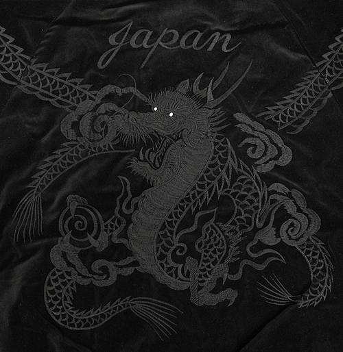 ブラックボディに黒糸刺繍で浮かび上がる迫力の双龍!フロント・バックだけでなく肩・腕部と全面に刺繍を施したゴージャスタイプ。大胆かつ繊細な仕上がりは1枚づつ丹念に手振りでつなぎ加工された特別仕上げで、落ち着いた大人の渋さを“黒×黒”で表現しました。スタンダードな『JAPAN』入り。