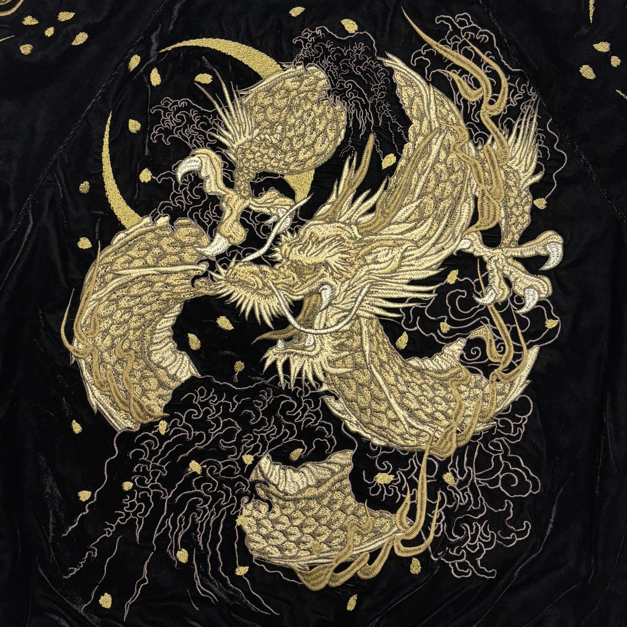 三日月をバックに咆哮する龍を全体にフューチャーした迫力あるスカジャン。可能な限り大きな絵柄を入れられるようデザインされた構図が印象的、大胆かつ繊細な仕上がりで針数を多く使った龍は迫力バツグン!美しさと躍動感が他とは違う自信のモデルです。フロント左右・バックだけでなく腕部にも刺繍の入ったゴージャスタイプ、ゴールド/シルバー刺繍2色をご用意いたしました。数量限定品。【中綿抜きモデル】