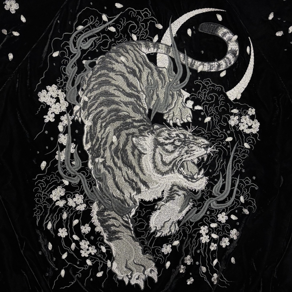 満月と桜をバックに炎をまとって咆哮する虎を全体にフューチャーした迫力あるスカジャン。可能な限り大きな絵柄を入れられるようデザインされた構図が印象的、大胆かつ繊細な仕上がりで針数を多く使った虎は迫力バツグン!美しさと躍動感が他とは違う自信のモデルです。フロント左右・バックだけでなく腕部にも刺繍の入ったゴージャスタイプ、ゴールド/シルバー刺繍2色をご用意いたしました。数量限定品。【中綿抜きモデル】