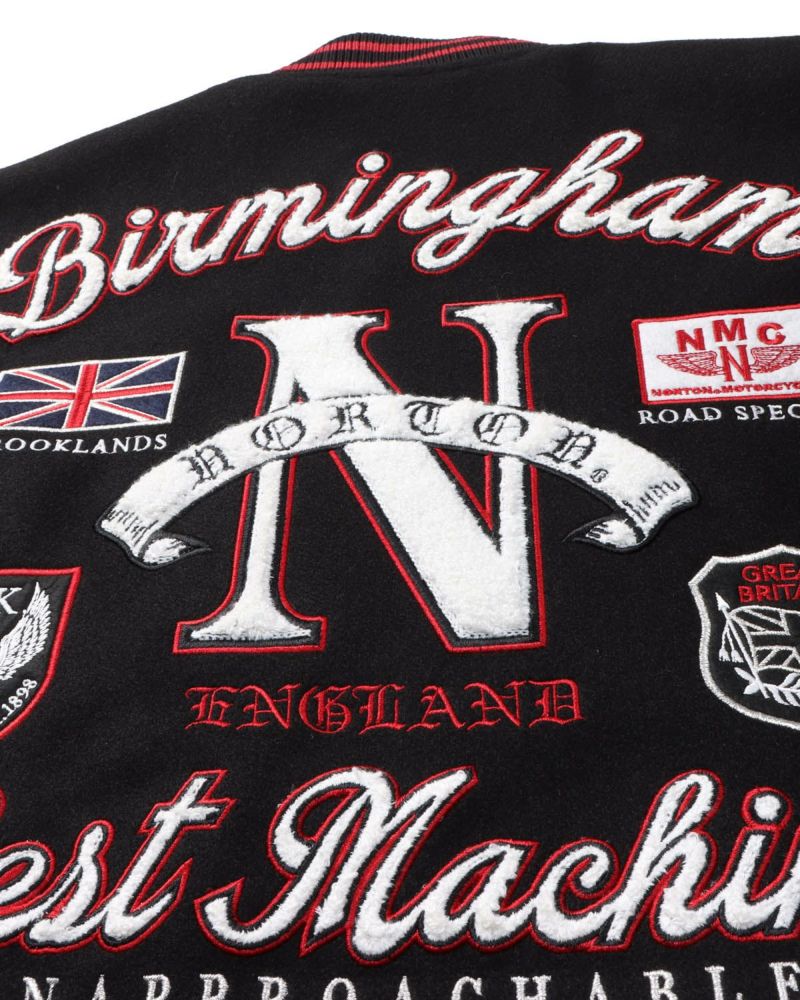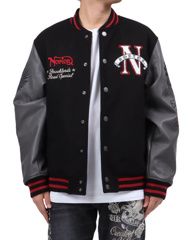 Nortonらしい加工感が満載の主役級スタジャン。立体的なサガラ刺繍やワッペンなど異なる素材の加工を駆使した贅沢かつ個性的な一着。ボディはぬくもり感が魅力のメルトン素材、袖はしっかりとしたPUレザー素材、内側は薄中綿入りダイヤキルトで保温力もグッド♪トレーナーやニットなど厚手のインナーも着込める安心サイズです。