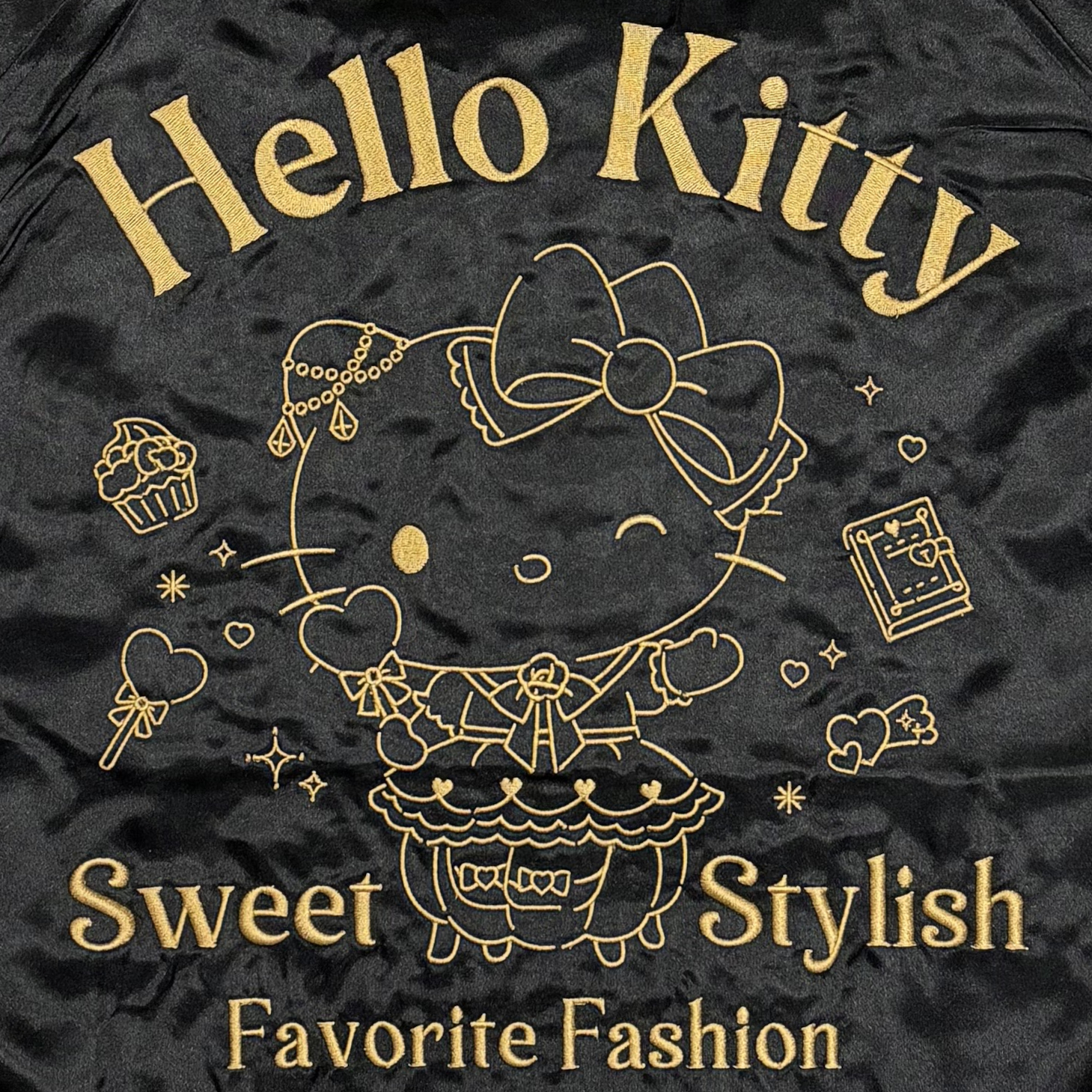 サンリオの絶対エース「ハローキティ」スカジャンです♪アクセサリーやキャンディ・香水といった可愛いアイテムを散りばめたモノトーン調刺繍のシックなデザイン。フロント左右にもキティとおしゃれアイテムを施した可愛い仕上がりです。リバーシブル半対面のバックはゴールド刺繍のキティ、フロント左右にキティとリボンを配したシンプルデザイン。腕部に『Hello Kitty』が入った5点刺繍・女性にもオススメな数量限定モデルです。【中綿抜きモデル】