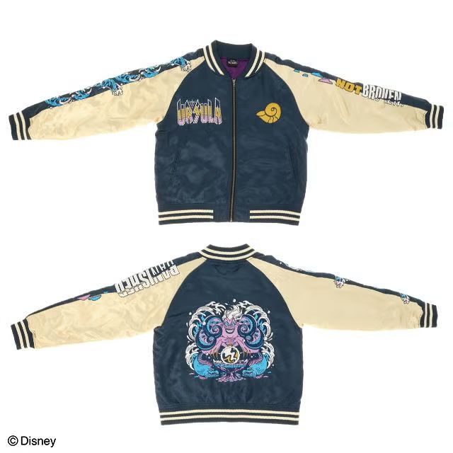 世界中で大人気の「Disney」スカジャンが登場♪ネイビー×ゴールドのカラーリングがキャッチーなファン必見のアイテム。フロントにアースラのロゴ、腕部にBANISHED. NOT BROKEN.が施され、バックには海の魔女・アースラが豪華な刺繍で大胆に描かれています。高品質な素材を使用し、快適な着心地を実現。日常のカジュアルな装いに特別なアクセントを加えるアイテム。【中綿抜きモデル】