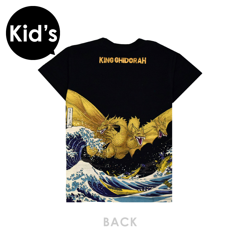 世界中の誰もが知っている日本の大怪獣「GODZILLA(ゴジラ)」のライバル怪獣・キングギドラTシャツです♪葛飾北斎の代表作である浮世絵・冨嶽三十六景《神奈川沖浪裏》との夢のコラボレーション。その世界観を浮世絵風の総天然色プリントで表現しました。