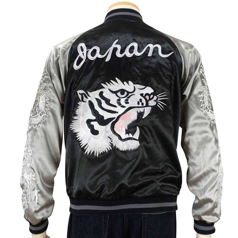【花旅楽団】の兄弟ブランド【JAPANESQUE】・龍虎/日本地図スカジャン。ブラックのサテンに白刺繍のコントラストがクールな表面、オールドレトロな雰囲気の裏面、龍と虎の対極的な見せ方も面白い。【中綿抜きモデル】