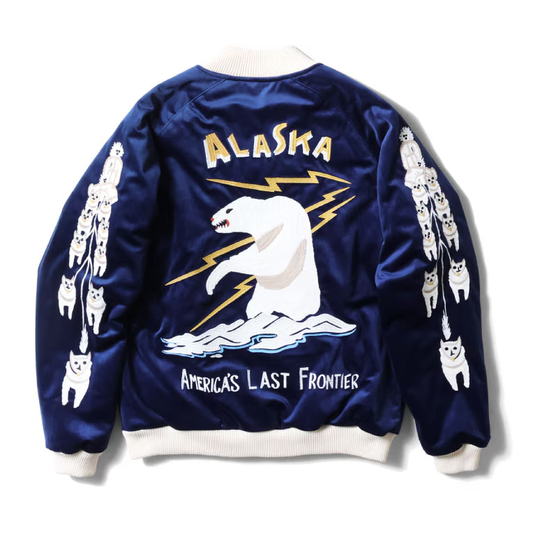 アラスカにある米軍基地の依頼で作られたアラスカモチーフのスカジャンを再現。バックに「ALASKA」やシロクマの刺繍などが配されているビンテージ感満載な1着。