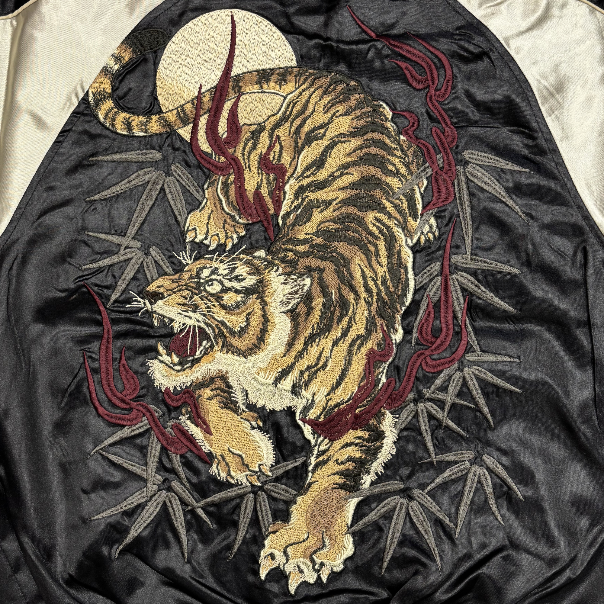 満月と笹の葉をバックに炎をまとって咆哮する虎を全体にフューチャーした迫力あるスカジャン!可能な限り大きな絵柄を入れられるようデザインされた構図が印象的、繊細な仕上げで紡ぎ出された刺繍は見事の一言です。フロント左右にも満月&虎を施した豪華な仕上がり、合わせやすい定番カラーリング3色をご用意いたしました。数量限定モデル。【中綿抜きモデル】