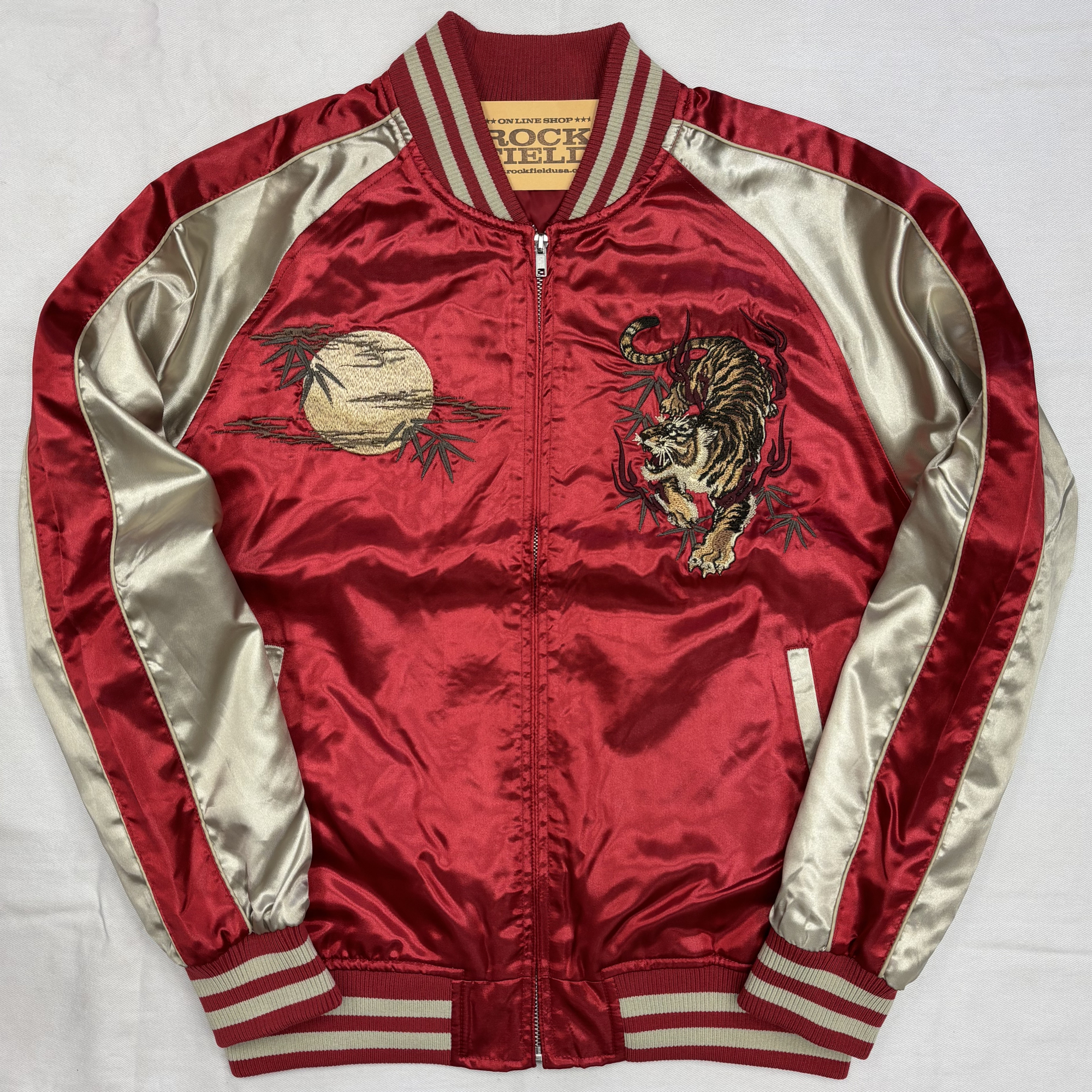 満月と笹の葉をバックに炎をまとって咆哮する虎を全体にフューチャーした迫力あるスカジャン!可能な限り大きな絵柄を入れられるようデザインされた構図が印象的、繊細な仕上げで紡ぎ出された刺繍は見事の一言です。フロント左右にも満月&虎を施した豪華な仕上がり、合わせやすい定番カラーリング3色をご用意いたしました。数量限定モデル。【中綿抜きモデル】