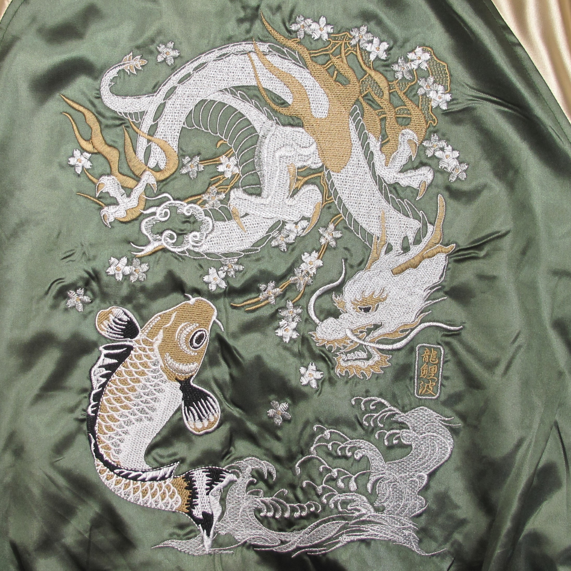BRSL-003 サテン 龍鯉波 スカジャン(中綿あり)《ダークグリーン×ベージュ》