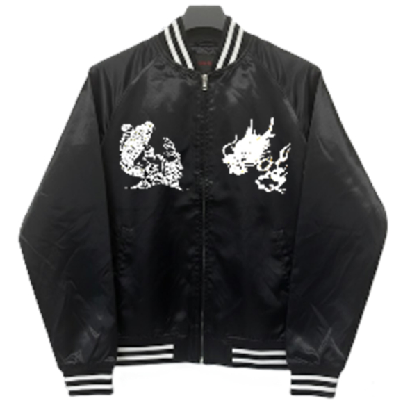 咲き乱れる桜の中、水面から飛び跳ねた鯉と龍がダイナミックに睨み合う『カープ&ドラゴン』スカジャン。可能な限り大きな絵柄を入れられるようデザインされた構図が印象的、繊細な仕上げでバックに紡ぎ出された刺繍は見事の一言!フロント左右にも龍と鯉を施した豪華な仕上がり、ブラックボディにシルバーホワイト刺繍で仕上げた渋いモデル。数量限定品。【2026年9月下旬発売】
