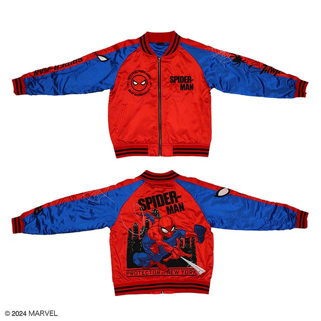世界中で大人気のコミック「MARVEL」のスカジャンが登場♪レッド×ブルーのカラーリングがキャッチーなファン必見のアイテム。フロントにはスパイダーマンの顔&ロゴ、腕部には蜘蛛モチーフが施され、バックには主人公・スパイダーマンが豪華な刺繍で大胆に描かれています。高品質な素材を使用し、快適な着心地を実現。日常のカジュアルな装いに特別なアクセントを加えるアイテム。【中綿抜きモデル】