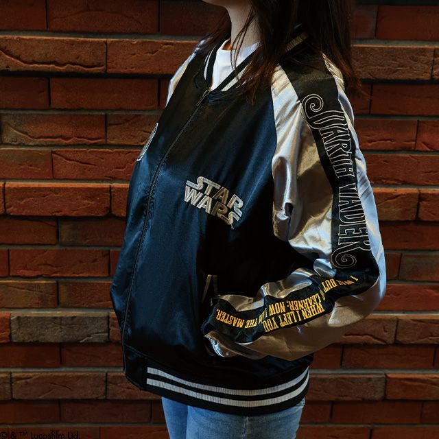 世界中で大人気の映画「スター・ウォーズ」のスカジャンが登場!黒と銀のコントラストが印象的なデザインで、ファン必見のアイテム。フロントには銀河帝国の国章、腕部にはDARTH VADERが施され、バックには最大の悪役ダース・ベイダーが豪華な刺繍で印象的に描かれています。高品質な素材を使用し、快適な着心地を実現。カジュアルなシーンにもぴったりで、スター・ウォーズの魅力を日常に取り入れたい方におすすめ。【中綿抜きモデル】
