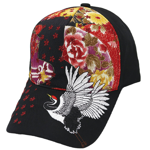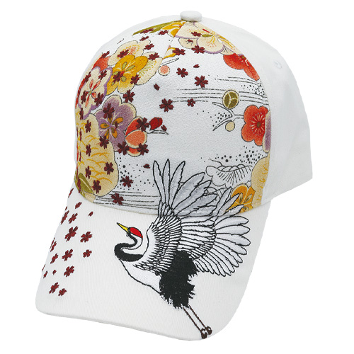 舞い散る桜とともに天に羽ばたく鶴を総天然色で優雅に描き出した和柄刺繍キャップ。背面アジャスターで調整可能な男女兼用フリーサイズ。