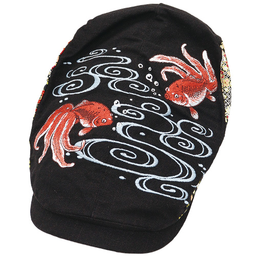和柄生地をバックに流水を泳ぐ金魚を総天然色で優雅に描き出した和柄刺繍キャップ。背面アジャスターで調整可能な男女兼用フリーサイズ。