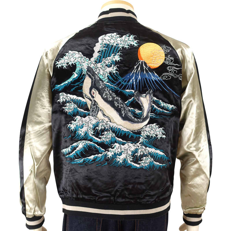 【JAPANESQUE】ブランド・波に鯨/風神雷神スカジャン。龍や虎などの定番刺繍に負けない勇ましさを誇る鯨のスカジャン。リバーシブルの半対面は質実剛健な表面に比べて実に賑やか。表裏で全く違う着こなしを楽しめます。【中綿抜きモデル】