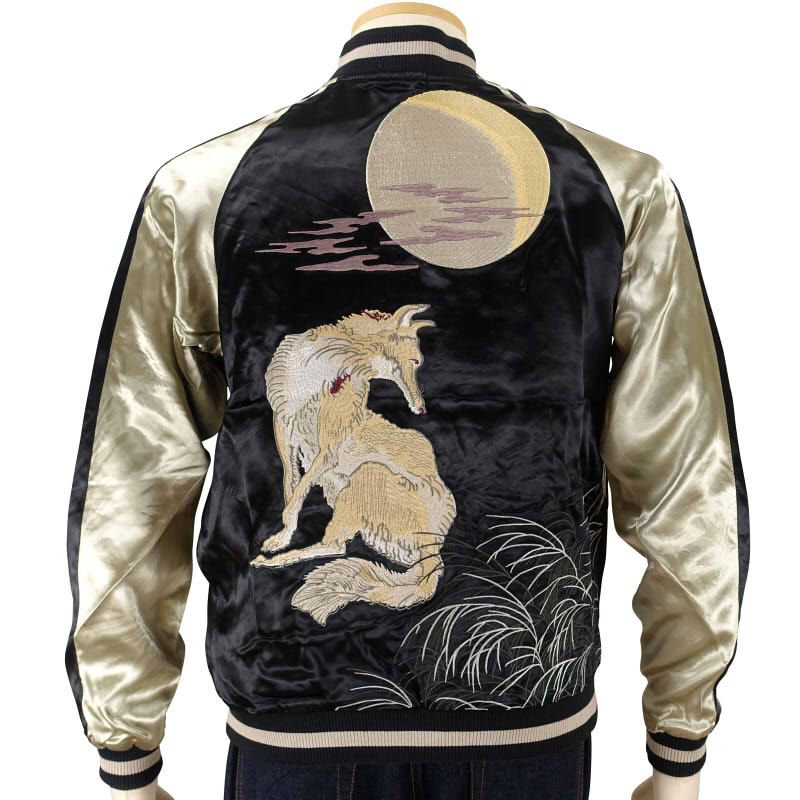 【JAPANESQUE】・月に狐/白孔雀スカジャン。ススキ野原に1匹たたずむ狐の姿が浮世絵ならではの奥深い静けさを感じさせます。リバーシブルの半対面は菊の花と共にたたずむ白孔雀。表裏で全く違う着こなしを楽しめます。【中綿抜きモデル】