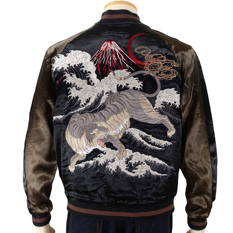 【JAPANESQUE】ブランド・波に見返り虎/滝に鯉スカジャン。三日月に照らされて紅色に染まる富士を背に荒波に向かって吼える虎。リバーシブルの半対面は滝と鯉の登竜門。表裏で全く違う着こなしを楽しめます。【中綿抜きモデル】
