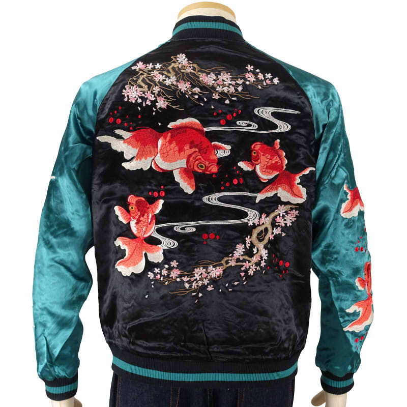 HGSK-035 桜金魚/梅と鶯 刺繍 リバーシブル スカジャン《ブラック×ターコイズブルー》《ターコイズブルー×ベージュ》