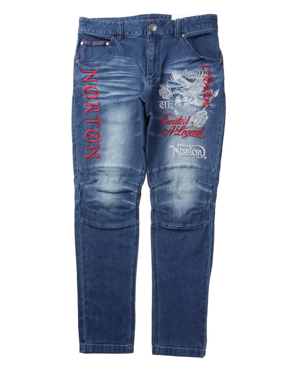 バイクモチーフ・グラフィックを大胆に刺繍したNortonらしい1本。加工1つ1つにこだわりました。ストレッチデニムを使用しており伸縮性&動きやすさもグッド!